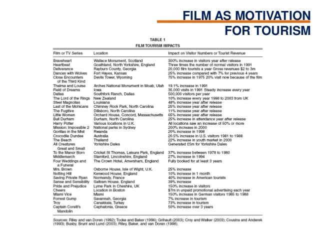 In his interpretation zimmermann describes film tourism as all forms of travelling to destinations which in general enable a connection with the world of film zimmermann 2003 p76further it can be divided into three separate sub categories including film promotion tourism travel film tourism4 and film induced tourism as illustrated in. This paper is a synthesis of major research themes issues and concepts. Much existing research is case study driven.