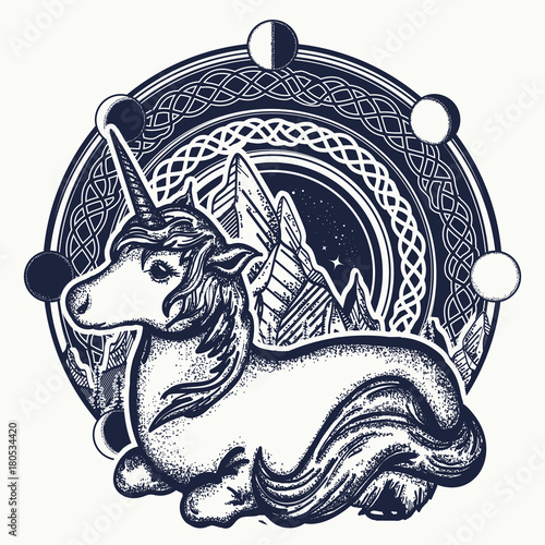 Unicorn Compass And Mountains In The Circle Tattoo Celtic Style Great Outdoors Symbol Of Dreams Fairy Tales Fantasies Adventure Tourism Meditation Unicorn And Magic Compass T Shirt Design Buy This Stock Vector News Related To Tourism